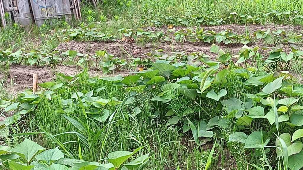 梅雨の雨の合間に、さつま芋から伸びたつる先を切って、1月半後の7月12日に植えました・・・水やりを毎日しなくても雨が降りますので、植えたらほったらかしで大丈夫です。