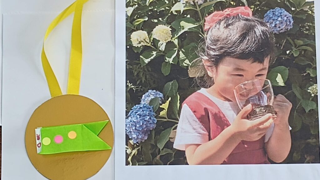 この絵の右側の孫が作ってくれましたのが・・・左側にある紙で作ってくれました金メダルの絵です・・・私の宝物です・・・野草茶をおいしい😋美味しいと言って飲んでくれます・・・元気が出るなぁ