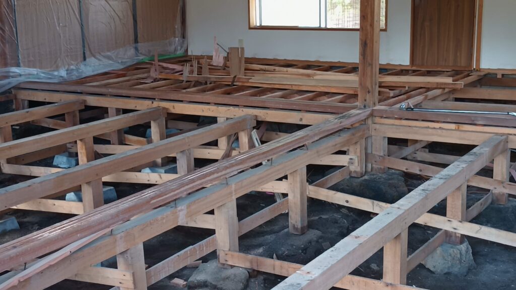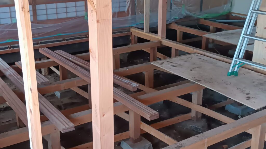 私は母家の傷みが気にかかるようになりまして、35歳の時(1990年)築70年に屋根の修理や根太の修理などを行いました・・・それから34年目の秋になりまして、ようやく母家の根太のゆがみや隙間風に気が付き35年ごとの節目の前に、親友の甥御さんに改築をお願いしまして現在進行中です・・・