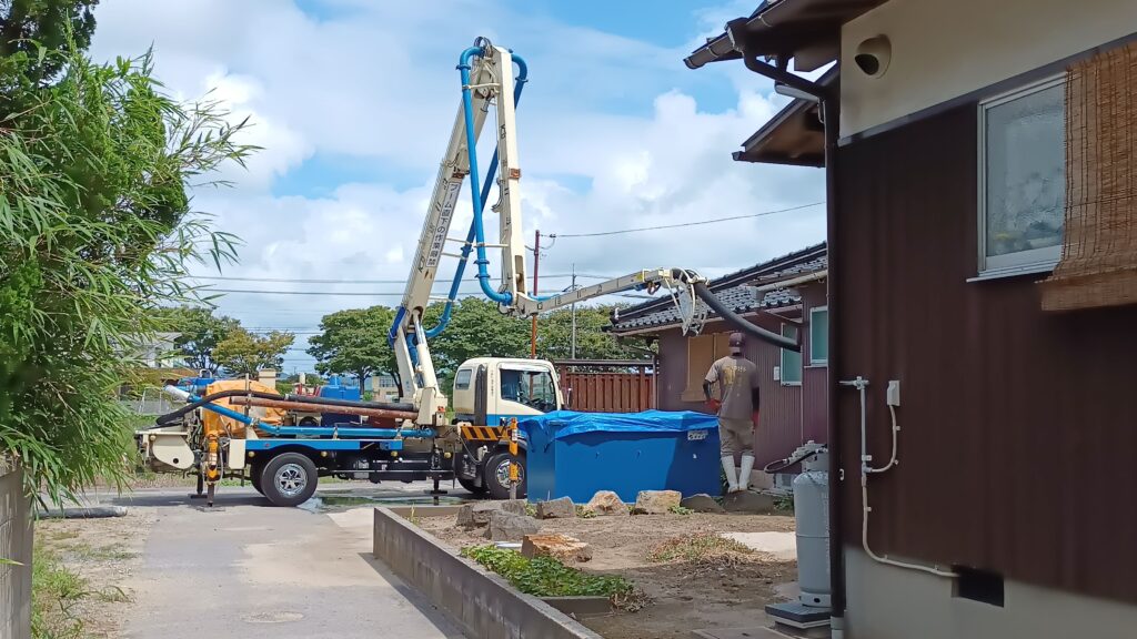 こちらの特殊車で一気にコンクリートを床下に流し込みまして、個々の石積を連結してまいります。・・・大正時代の建築をそのまま保存して残したいのですが・・・痴ほう症も考えなければなりません・・・ちょっとした段差でつまずき骨折をしてしまったら、病院で骨折治療して養生している間にぼけてしまいます・・・片方では防災対策も必要ですし、そこで病院のように段差のないバリアフリーにしておくことになりました・・・