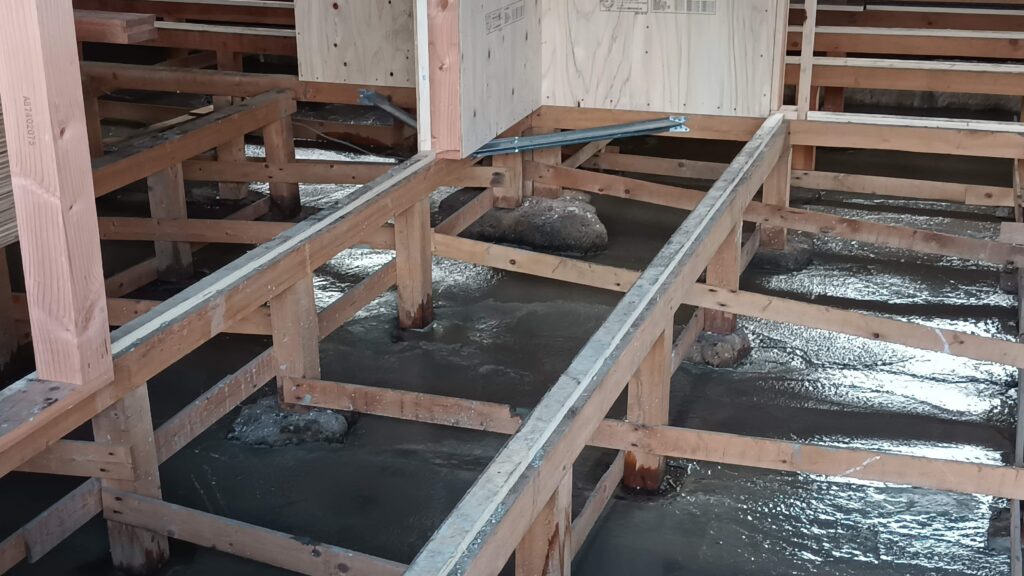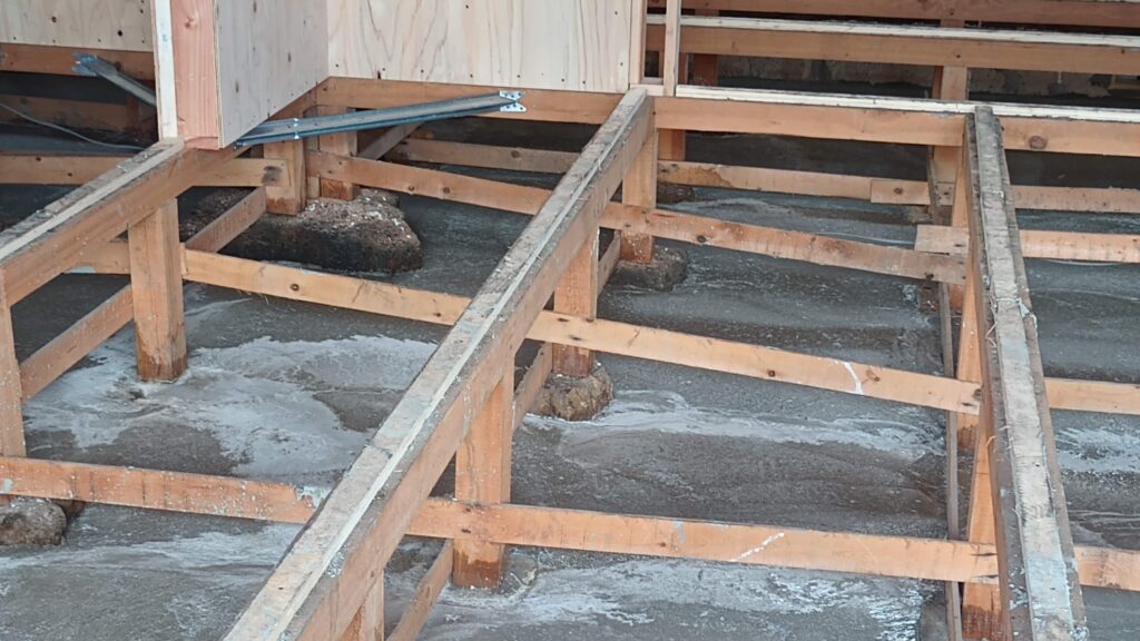 こちらの絵・・・縁の下の補強の為に、砂の上にのっています石をコンクリートで補強工事をしてもらいます・・・これで、地盤のゆるみや地すべりを一体的にする作戦です・・・