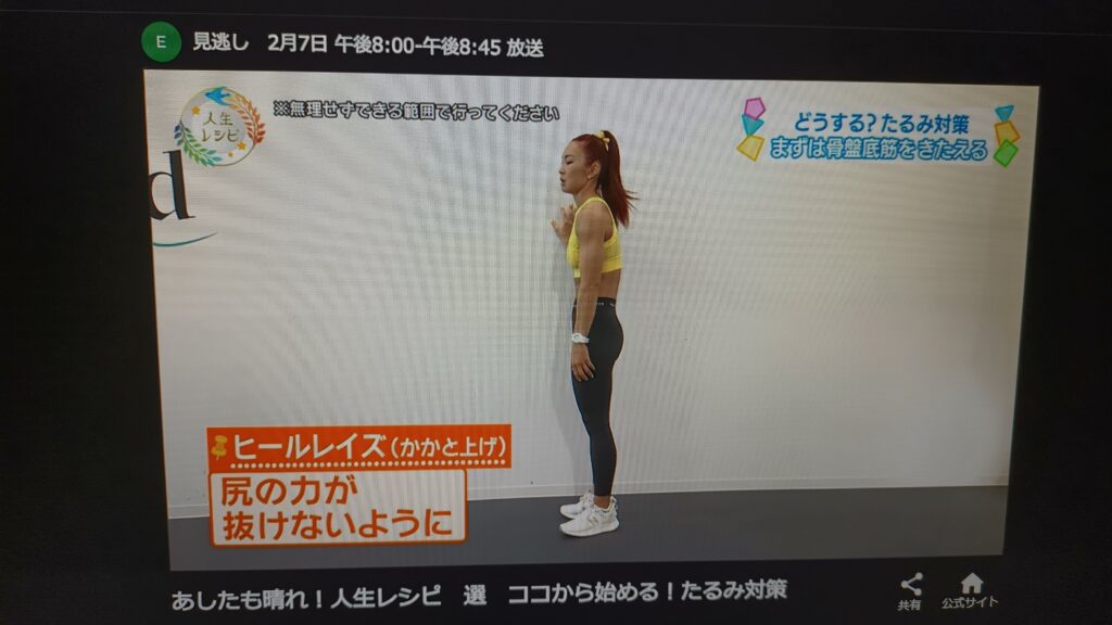 そこで 人生レシピではたるみ改善として3つの行動療法を紹介されました・・・ドローインのポーズで、おなかをへこませ、かかと上げ・・・その時にお尻の両側にはえくぼを確認です・・・