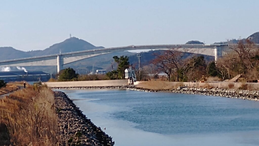 前方に見えますコンクリート製の橋を江島大橋(通称べた踏み坂)と言いまして、そのふもとにあります渡漁港は、この干拓地のすぐ先にありまして・・・この絵には写っていません・・・