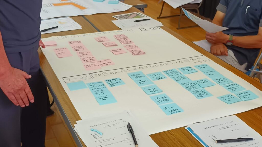 参加者は、3つのグループに分かれ個人個人の提案を出し合いまして、意見ごとに共通項目をまとめてまいります・・・境港市の市役所の方も意見集約に加わってくださいました・・・