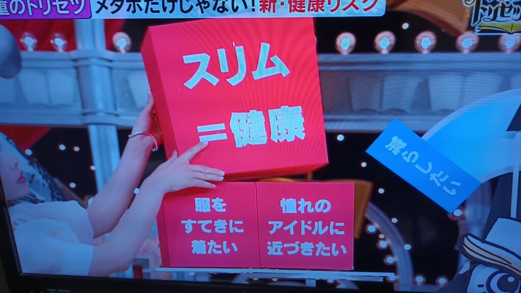 NHKのあしたが変わるトリセツショーでは・・・スリムは健康ではありません・・・脂肪を減らそうと努力しますと筋肉も激減してしまい寿命をまっとうできなくなる可能性があります・・・とのことでした